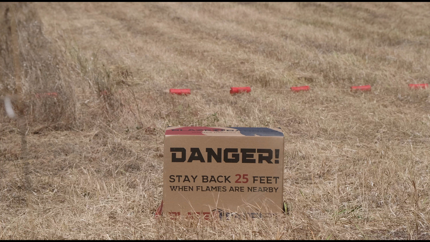 The Blaze Barrier will suppress the flames when they reach it, and not before. The expelled payload of fire extinguisher powder knocks down the big flames and covers the surrounding vegetation with powder. This keeps small embers from re-lighting on the other side.